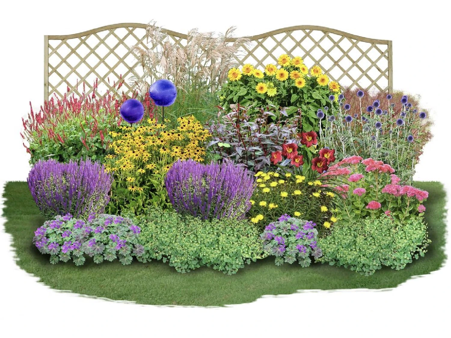 Jedes Jahr aufs Neue erfreuen die ausdauernden Stauden und Gräser mit ihren Blüten und sind bis weit in den Herbst hinein ein echter Hingucker! Lassen Sie sich verzaubern von leuchtendem Sonnenhut, Staudensonnenblume und Alant, fein kontrastiert durch buntblättrigen Knöterich. Auch für Insekten ist in diesem Beet gesorgt. Kugeldistel, Fetthenne, Ziersalbei und Gartenknöterich sind wahre Bienen- und Hummelmagneten und sorgen den Sommer über für behagliches Summen und Brummen.