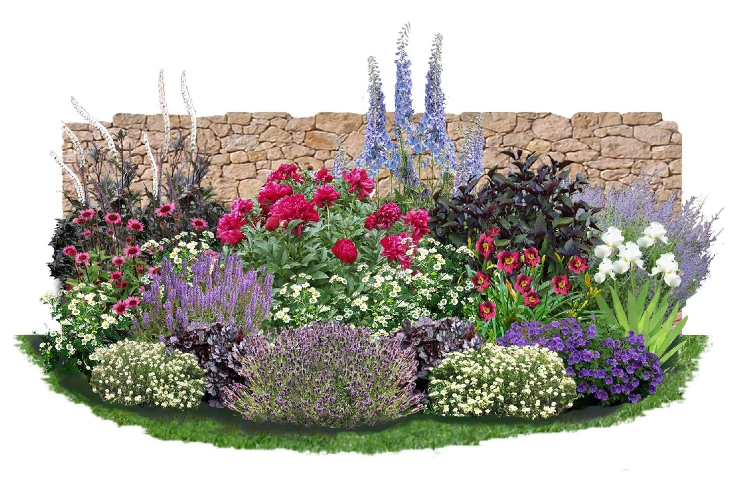 Das Beetpaket „Beet in Feierlaune“ kommt hier wie gerufen. Auf 4,5 m² Fläche präsentiert es eine Vielzahl von herrlichen, ausdauernden Prachtstauden, die für sechs Monate im Jahr für Blüten sorgen. Der Wonnemonat Mai startet mit einer duftenden, weißen Bartiris sowie einer üppigen, gefüllt blühenden Pfingstrose, die von niedrigen Sonnenröschen sowie violettem Ziersalbei begleitet werden. Im Juni und Juli trumpfen dann himmelblauer Rittersporn, samtiger Prachtstorchschnabel, leuchtender Purpursonnenhut, aromatischer Lavendel und lila Blauraute auf. Zartes Mutterkraut webt dazu seine kleinen weißen Blüten durch das Beet. Der Spätsommer und Herbst betört mit einer eleganten, robusten Taglilie in sattem Rot, sowie den cremeweißen Blüten der dunkellaubigen Silberkerze und dem Wasserdost.