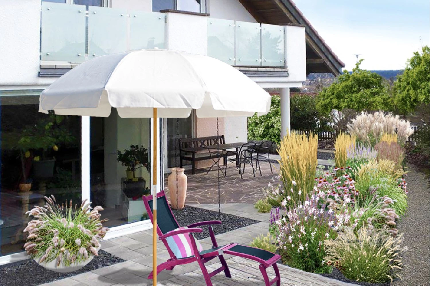 Leicht lässt sich eine Kiesflächen mit einem pflegeleichtem Beet „Gräsermeer“ beleben und sorgt dann für zart-wogende Ausblicke. Nur einmal im Frühjahr schneidet man die Gräser darin kräftig zurück. Den Rest des Jahres braucht man sich kaum um sie zu kümmern. Stattdessen belohnen uns Federborstengras, Reitgras, Rutenhirse, Wimper-Perlgras und Chinaschilf mit feinen Blatttexturen, prächtigen Gräserblüten und toller Herbstfärbung.