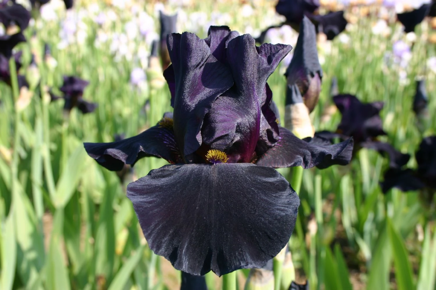 Der honigfarbene Bart gibt der samtig schwarzen Blüte der Iris Barbata-Elatior ‚Old Black Magic‘ eine elegante Note. Diese duftende Schwertlilie wird 100 cm hoch und ist reich verzweigt.