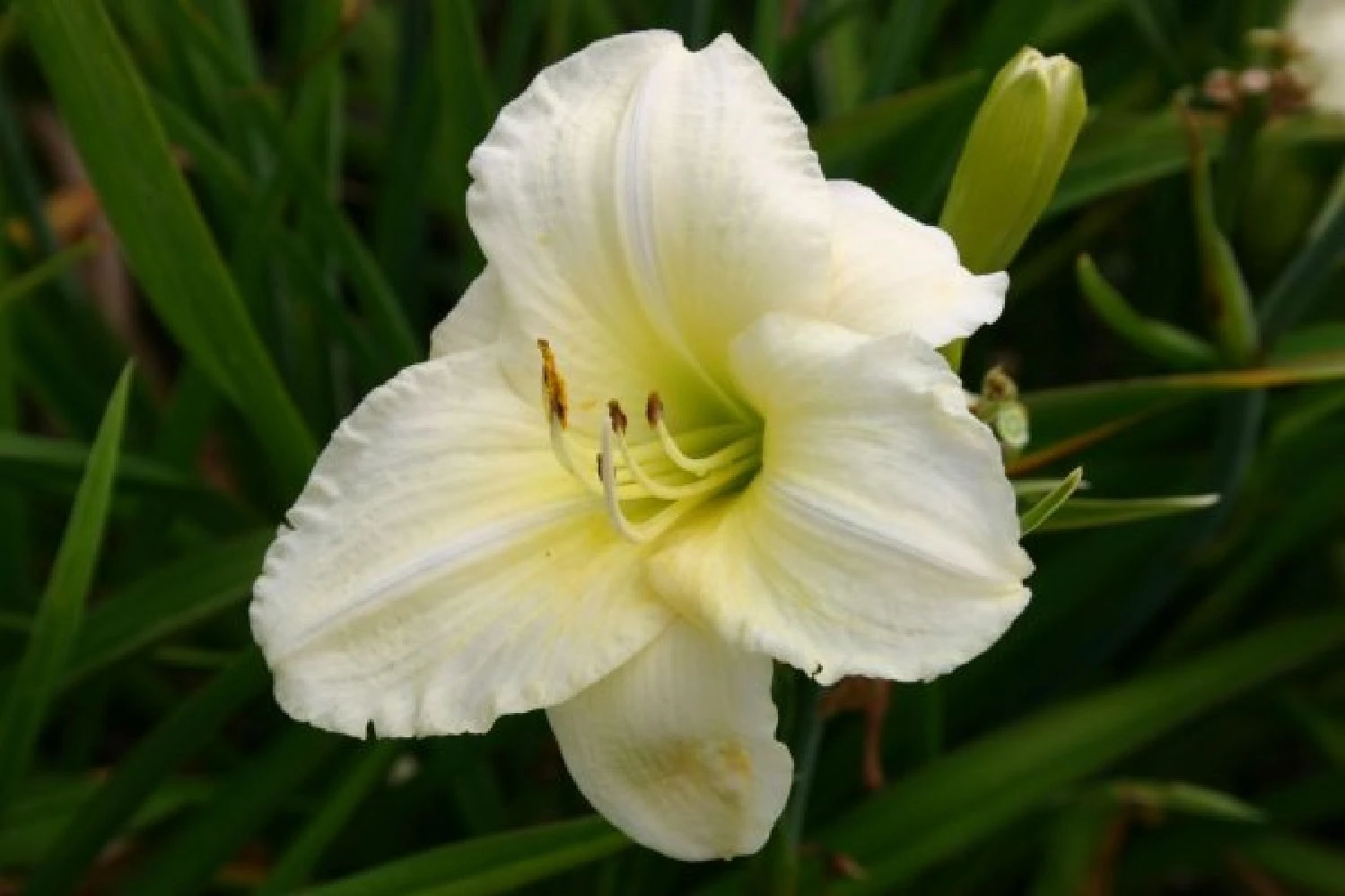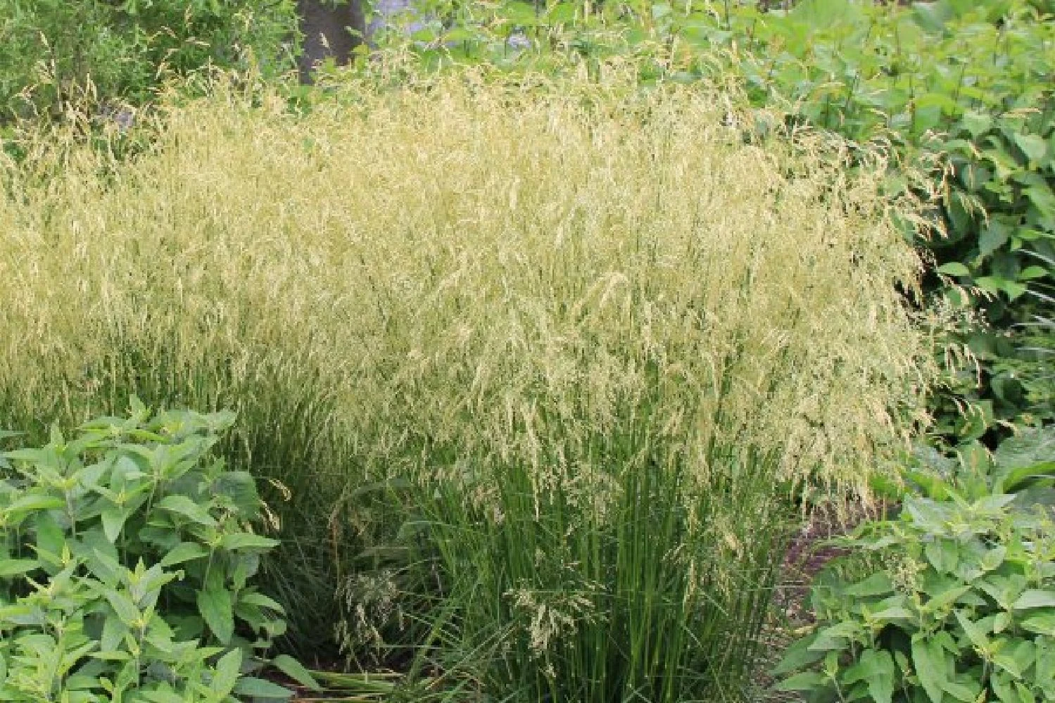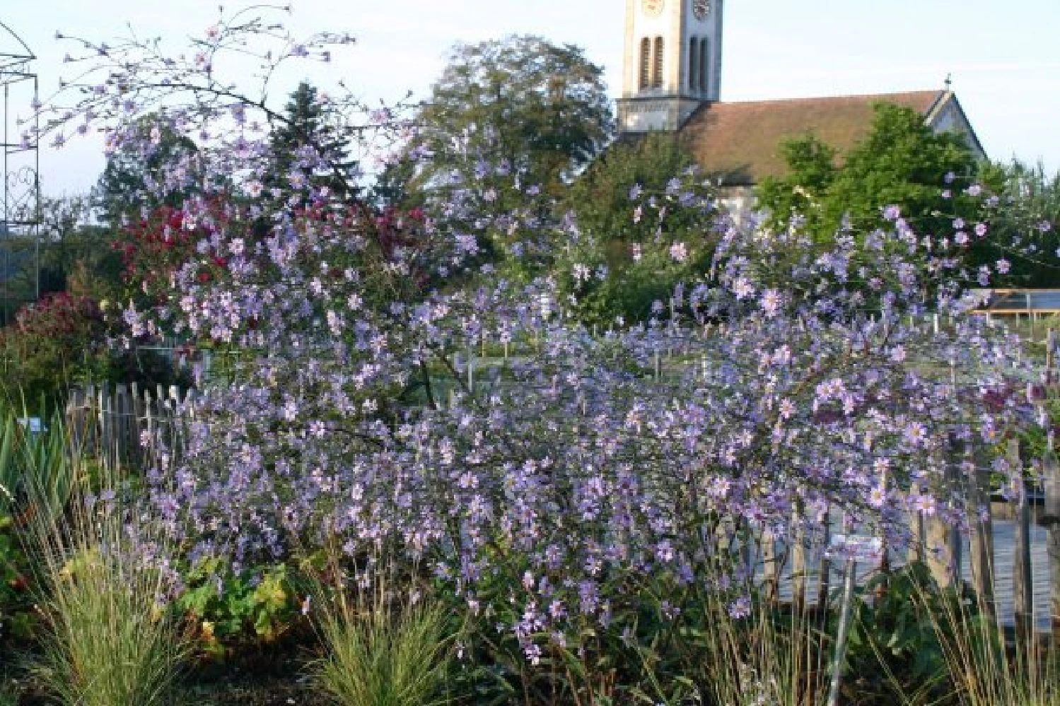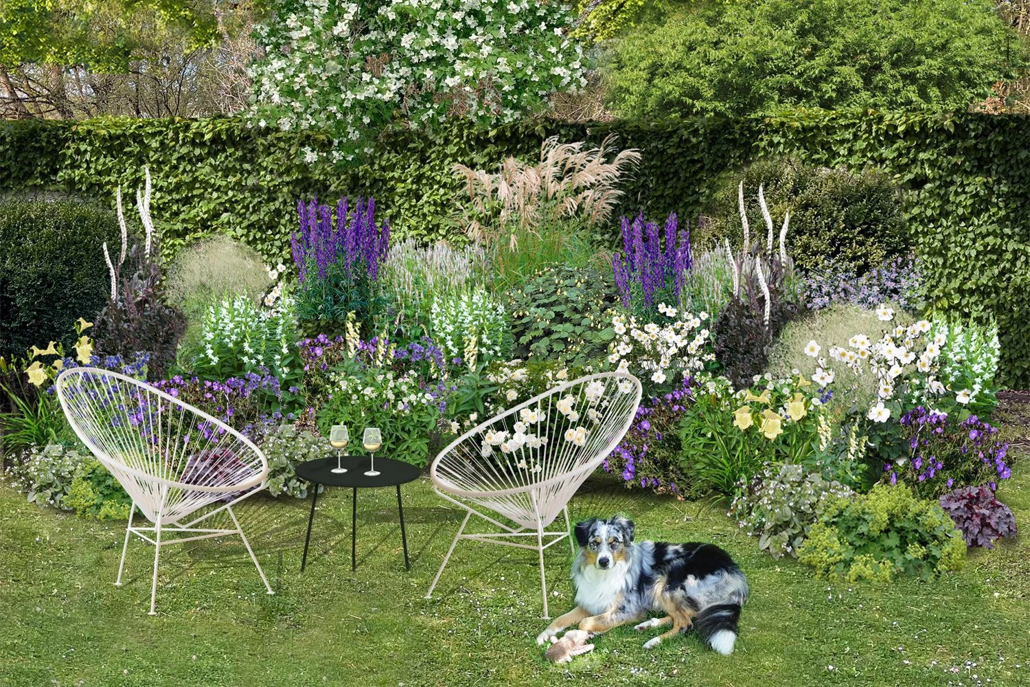 Die L-förmige Beetkomposition entlang des Sitzplatzes beinhaltet eine Vielzahl an Stauden, die bestens mit wechselnder Besonnung zurechtkommen und von Mai bis Oktober für eine zauberhafte Umrahmung sorgen. Gräser wie ein üppiges Chinaschilf (Miscanthus) oder die wie ein Schleier anmutende Gartenschmiele (Deschampsia) sorgen dabei für Struktur und Weichzeichnereffekte. Ergänzt werden sie von Blütenstauden in Weiß, Zartgelb und Violettblau in unterschiedlicher Höhe, darunter Waldglockenblumen, Herbstanemonen, Taglilien, Eisenhut und Storchschnabel. Ein Höhepunkt ist zweifellos die Blüte der Silberkerzen im September, die sich elegant über dem Beet erheben.