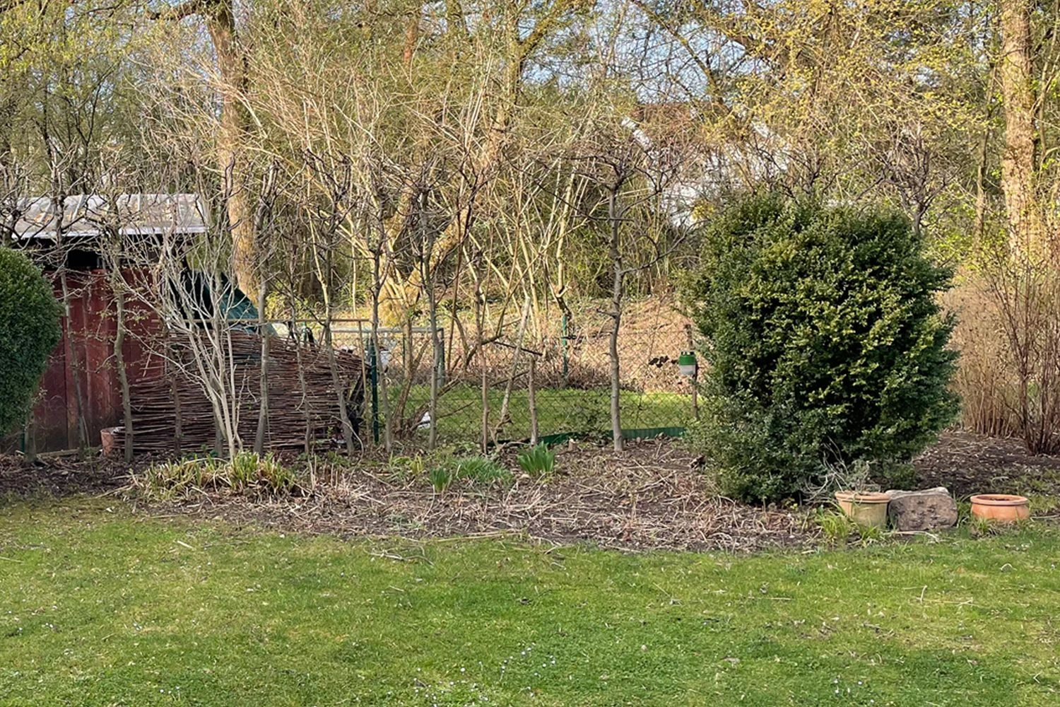 Um einen solch halbschattigen Standort geht es in diesem Beispiel. Ein alter Hof mit herrlich rustikaler Scheune im Hintergrund wird mit einem neuen Sitzplatz ausgestattet, der im Sommer bei hohen Temperaturen für einen angenehmen Aufenthalt im Freien sorgt. Schatten spenden in diesem Fall eine Reihe von lichten Laubbäumen wie Linde, Ahorn und Walnuss auf dem Nachbargrundstück, sowie umliegende Gebäude.