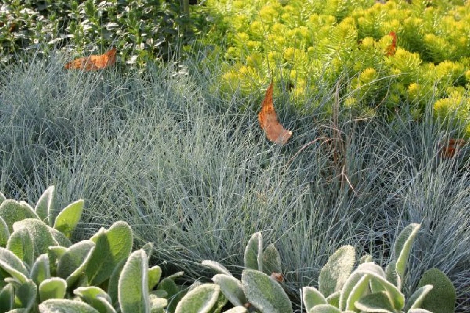 Um der geschlossenen Wand die Schwere zu nehmen, bietet es sich an, mit einem vorgelagerten Beet einen optimalen Übergang zwischen Garten und Grenze zu schaffen. Durch ein geschicktes Anheben der Beetfläche mit Hilfe einer niedrigen Stützmauer wird zudem im Hintergrund das Betonfundament des Sichtschutzzaunes kaschiert. Die Bepflanzung orientiert sich am Stil des Zaunes und ist – obwohl insgesamt eine Augenweide – eher maskulin, kräftig und in gedeckten Farbtönen gehalten. Das Beetpaket „Das Männerbeet“ wurde für diesen Garten mit etwa 5 m Breite zweimal verwendet, um die Fläche gut auszufüllen. Verwendet man es mehrfach, kann man auch die Anordnung der Pflanzen ein wenig verändern, um einen Spiegelungseffekt zu vermeiden.